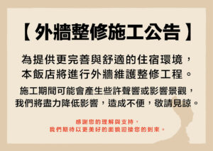 To provide you with a better service experience in the future. The hotel’s exterior walls are currently undergoing maintenance. There will be scaffolding outside your room.